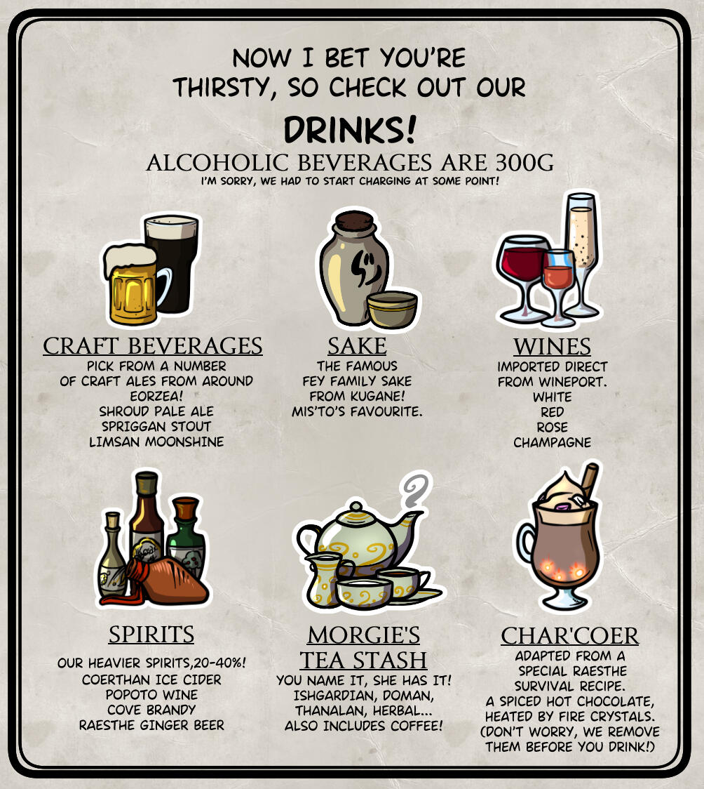 Check those out here.If you'd like to work with the First Steps for events, or for your character to use the performing space or set up a shop stall, please let me know! I'd be delighted to set up the space for you in advance.FFXIV is a Teen-rated game and we request players adhere to that rating in public RP. The Steps is designed to cater to adventuring, so themes such as combat, dealing with injury or other violence-based tropes may be prevalent. Only engage in RP that you are comfortable with! If you've concerns on any RP happening in the venue, reach out to Mis'to. If it is breaking TOS, reach out to the GM's immediately.When using certain mods, please bear your fellow players in mind when using them. They may be unaware that their character appears different on your screen and for some this could be distressing or even triggering. Please do not call attention to them, either in (IC) or out (OOC) of character. If you experience upsetting behaviour in this manner, please report this to the GM's.The Steps is welcoming to all manner of characters, but I would request that players roleplaying NPC lore characters do not bring those characters to the Steps. This is an RP style I personally do not like, and it runs a high risk of spoilering content to players. In the same vein, we respectfully ask that any characters associated with other shards do not openly act as such.Finally, have fun. Engage in RP and themes that you enjoy and take satisfaction in. Be kind and respectful to your fellow players and enjoy the rich world that Square Enix has given us!